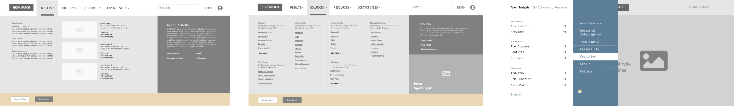 One of the key challenges was analyzing the previous HighMatch IA to identify where improvements could be made. Due to the site’s content-heavy nature, we knew refining the main site navigation would be a central part of the design process.
