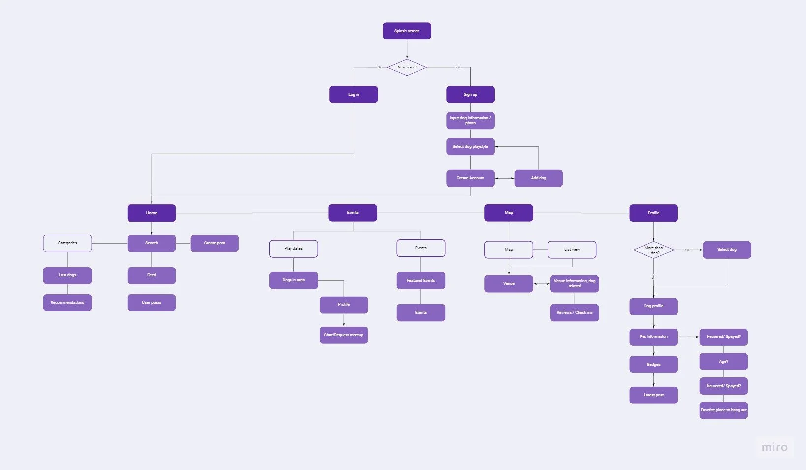 After our research and site map exercises, we created a user flow for our app. We made sure to include personalization options during the onboarding so users could best find potential matches for their dog(s).